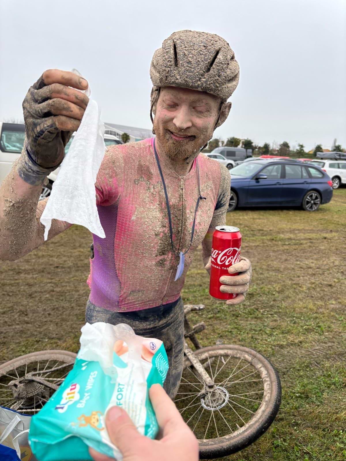 After finally crossing the line (relief doesn’t even begin to describe it), we made a beeline for the pasta tent. Honestly, I could’ve eaten twenty portions. Then it was back to the apartment to attempt a shower, which promptly clogged with the sheer volume of mud we trampled in. We were absolutely caked, head to toe.