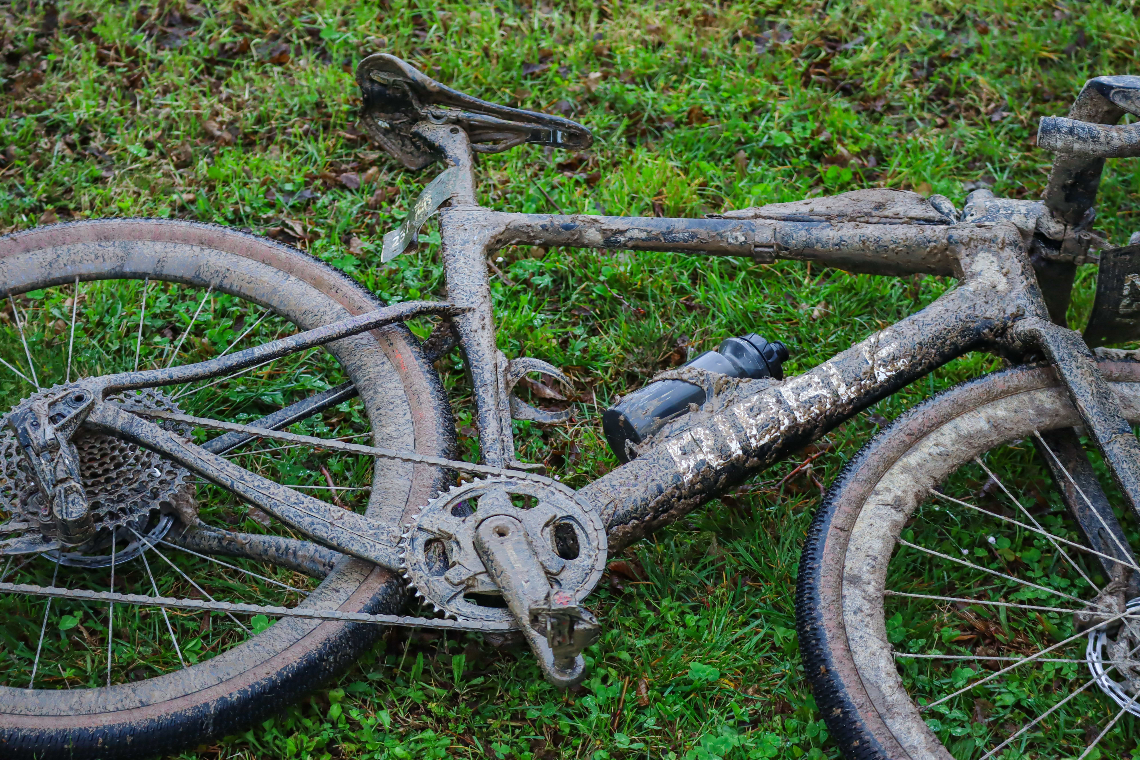By 5am on race day, we were up and eating breakfast, bleary-eyed but excited. We rolled out to the start at Lago le Bandie and everything still felt manageable. This was until we hit the first grass section. Or, what had been grass. Now it was a churned-up trench of sticky mud. It hit me immediately: road pedals were a terrible decision. I'd been fine in practice, but the conditions had changed completely, and now I was constantly dismounting, slipping through the mud, crossing rivers, then remounting only to have to stop and dig the gunk out of my cleats before I could clip in again.